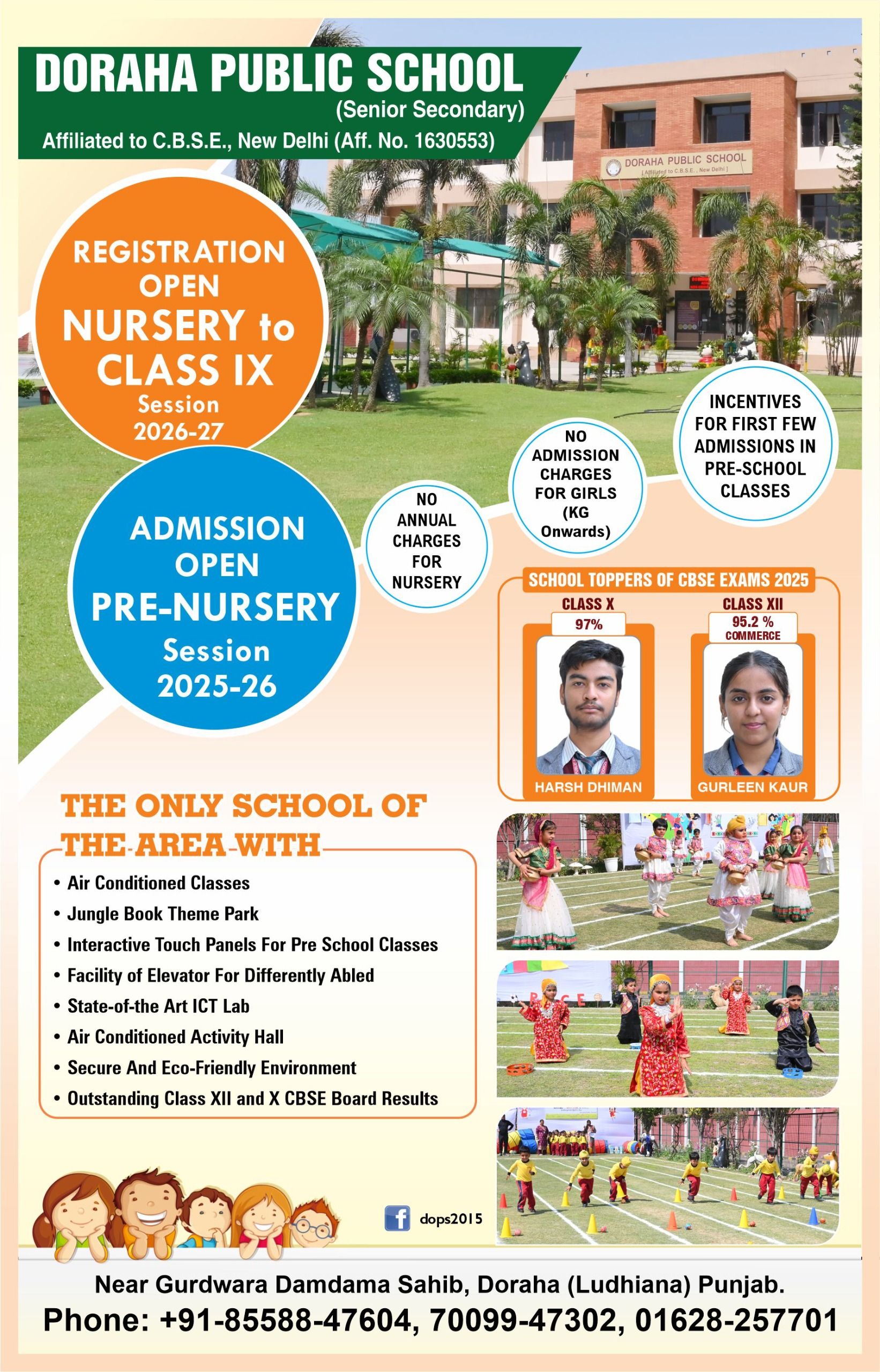 Doraha Public School is about the spirit, morals and ethics of India. The spirit, that makes human beings humane, pervades the school, moulding scholars and sportsmen to steer India on its path of progress. A natural and tranquil institution away from the din of the city it nurtures an ideal educational environment for both students and teachers. The beauty and invigorating atmosphere of the school is a result of its unique setting admist a lush green pollution free environment. The historic Damdama Sahib Gurdwara of Sri Guru Hargobind Sahib Ji and the fort of Sher Shah Suri provide a majestic backdrop to this school. The Sirhind Canal flowing next to the school makes it a picturesque spot. The calm and serene location is most conducive to good education.
